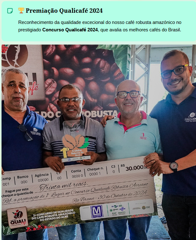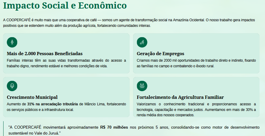 em sussurros eternos, a COOPERCAFÉ brotou como uma semente de luz em 17 de setembro de 2021. Em Mâncio Lima, Acre, somos o laço que entrelaça cerca de 220 famílias de agricultores, artesãos da terra que transformam o solo em sinfonia de esperança.